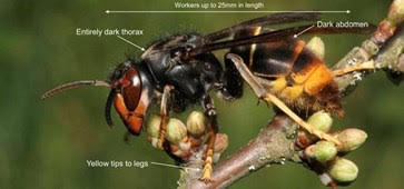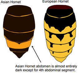 You can identify an Asian hornet from a European hornet from its dark abdomen, as shown in the diagram.