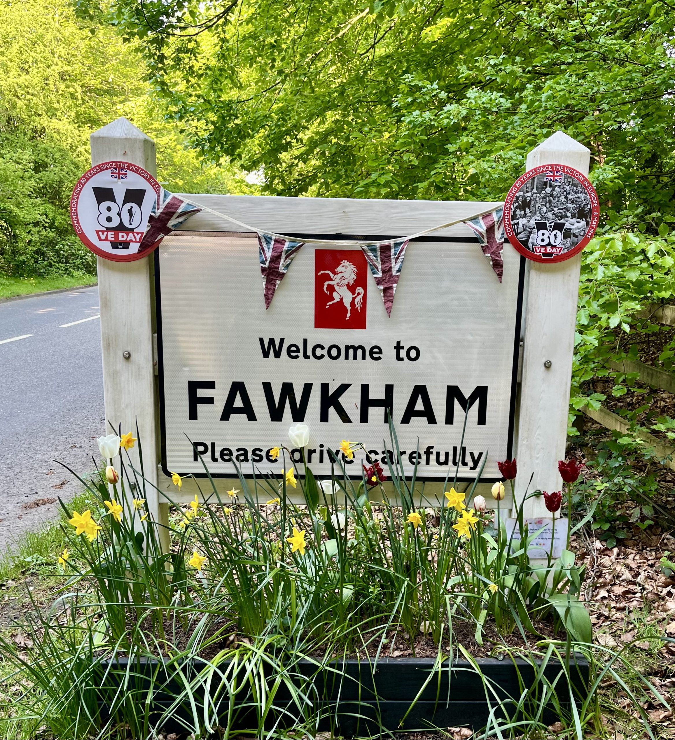 Welcome to Fawkham sign with Union Jack bunting and VE Day 80 signs